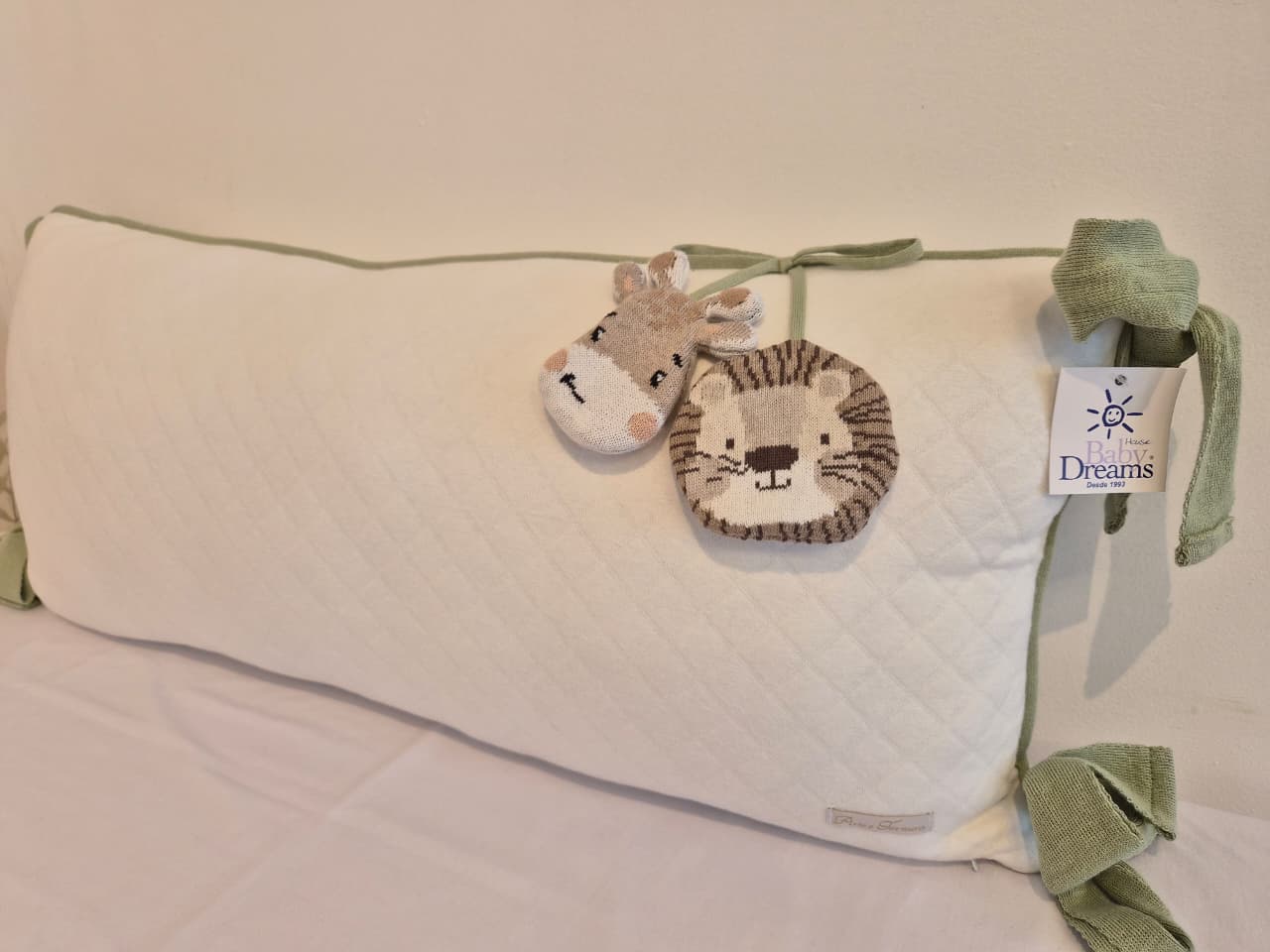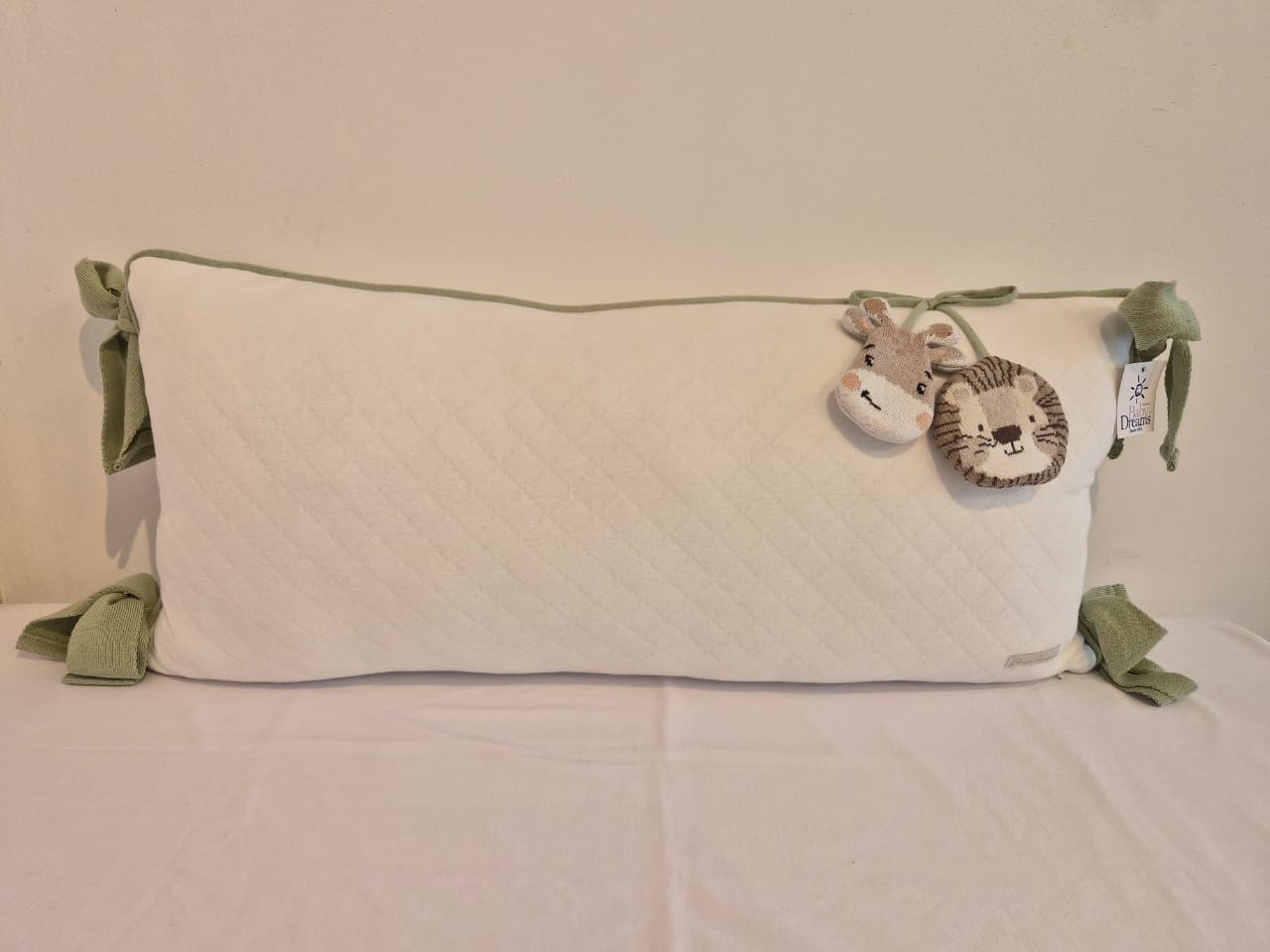 Almofada cabeceira para berço padrão americano em jacquard pérola com roletê limonada e pingentes girafa e leão 70 x 30 cm.Entre em contato com a nossa esquipe de vendas e encomende já a sua.
