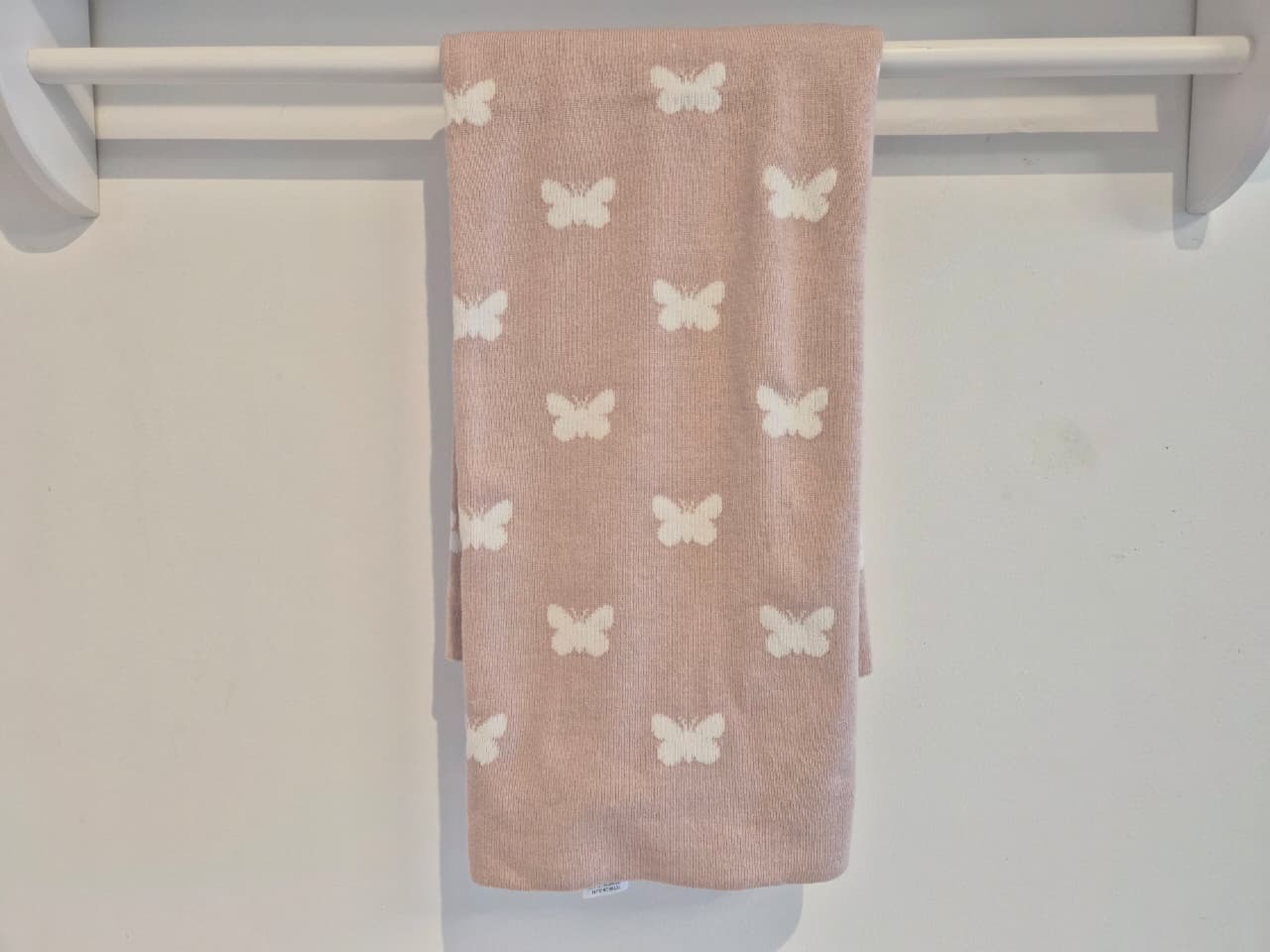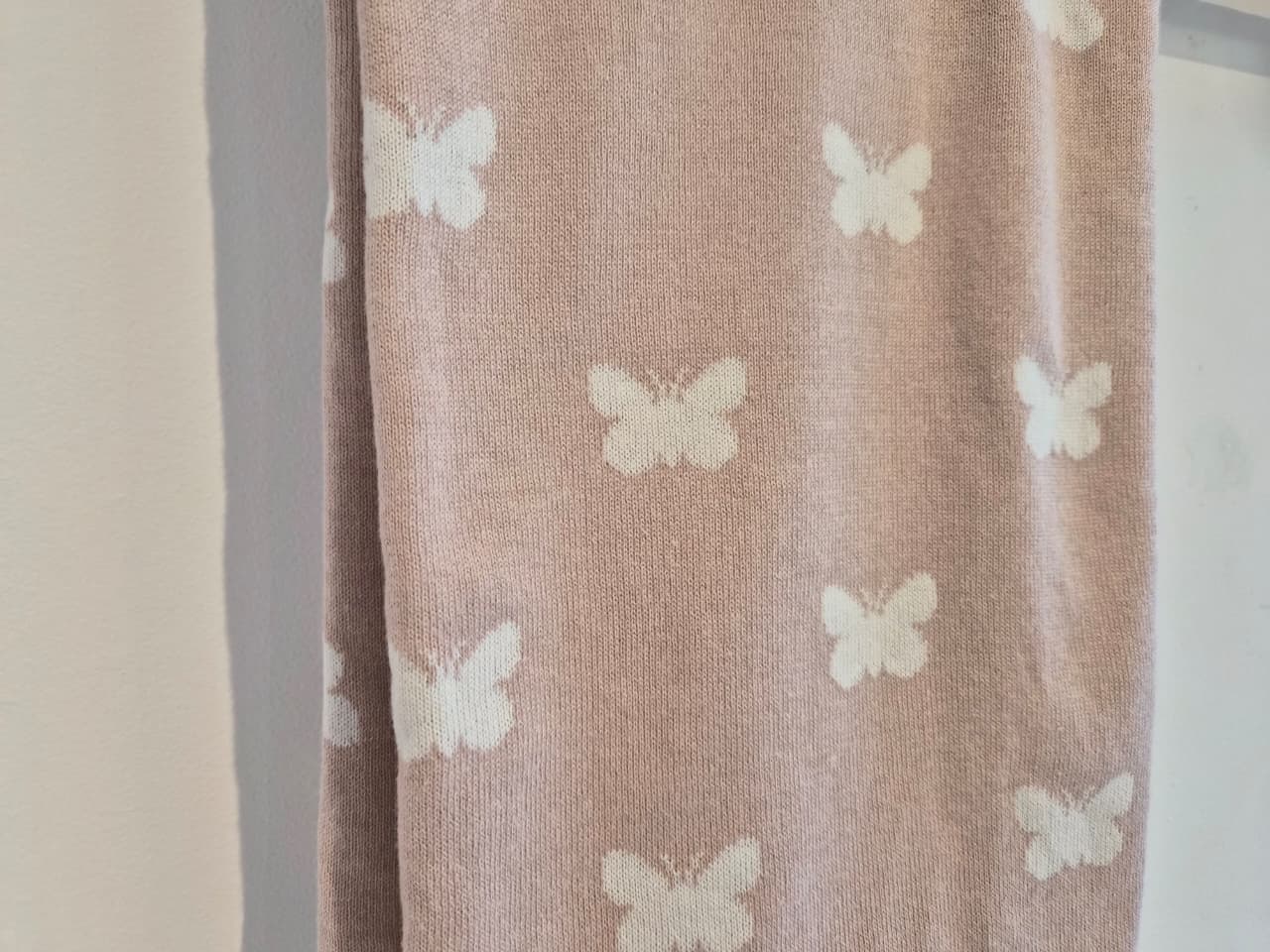 Linda manta de colo rosa una em tricot com lindas borboletinhas na cor off white.medindo 90 x 90 cm.Entre em contato com a nossa equipe de vendas e tire as suas dúvidas.