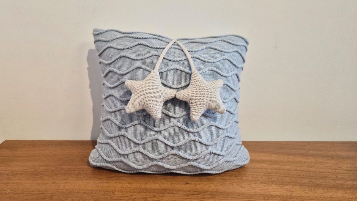 Conforto e beleza na medida certa nessa almofada de tricot Vancouver na cor azul Dream 30 x 30cm com pingente estrela na cor cinza 869.Perfeita!Consulte nossa equipe de vendas e tire suas dúvidas.