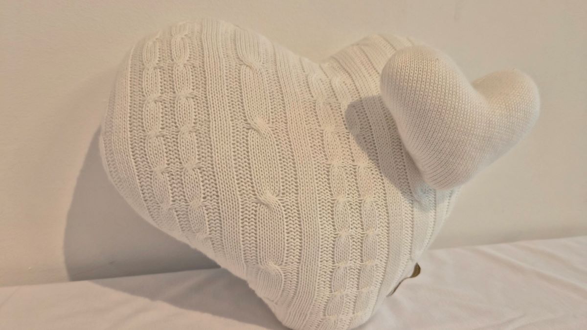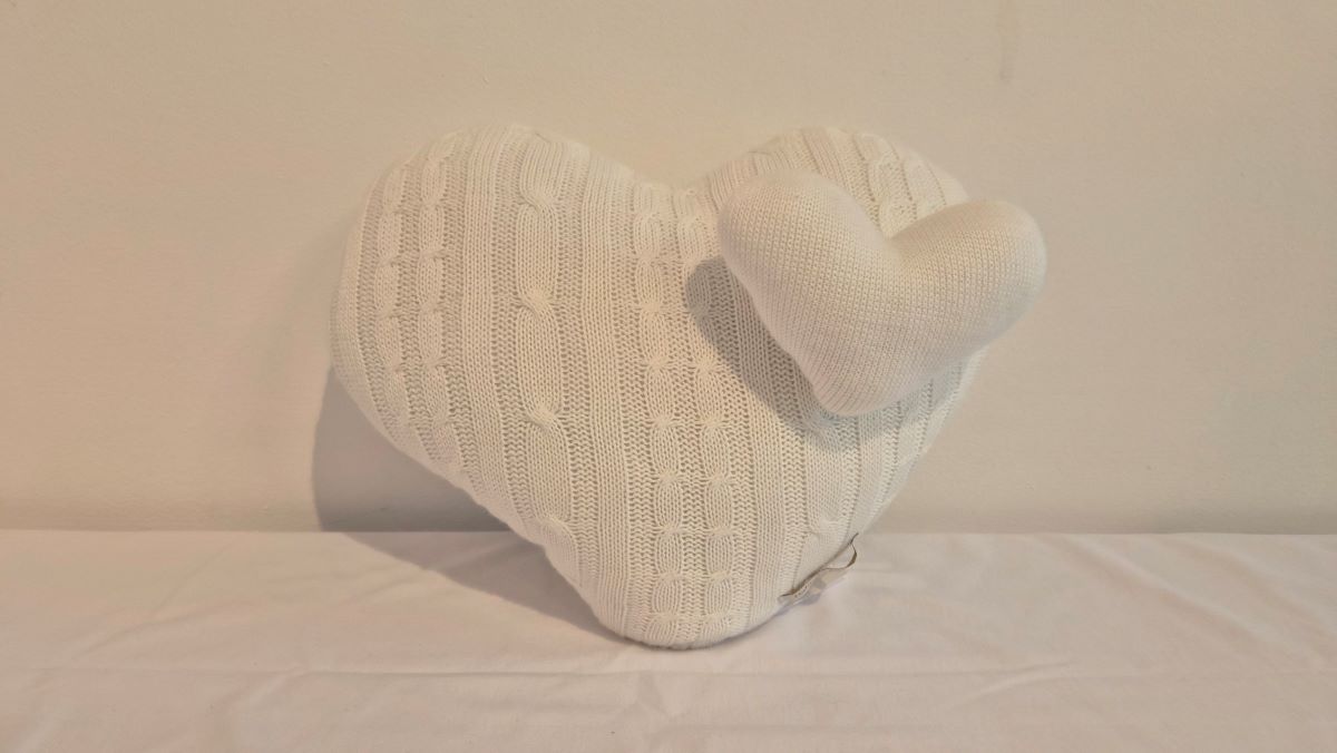 Linda e delicada almofada em formato de coração com aplique coraçãozinho.Toda em tricot Off White.Consulte nossa equipe de vendas e tire suas dúvidas.