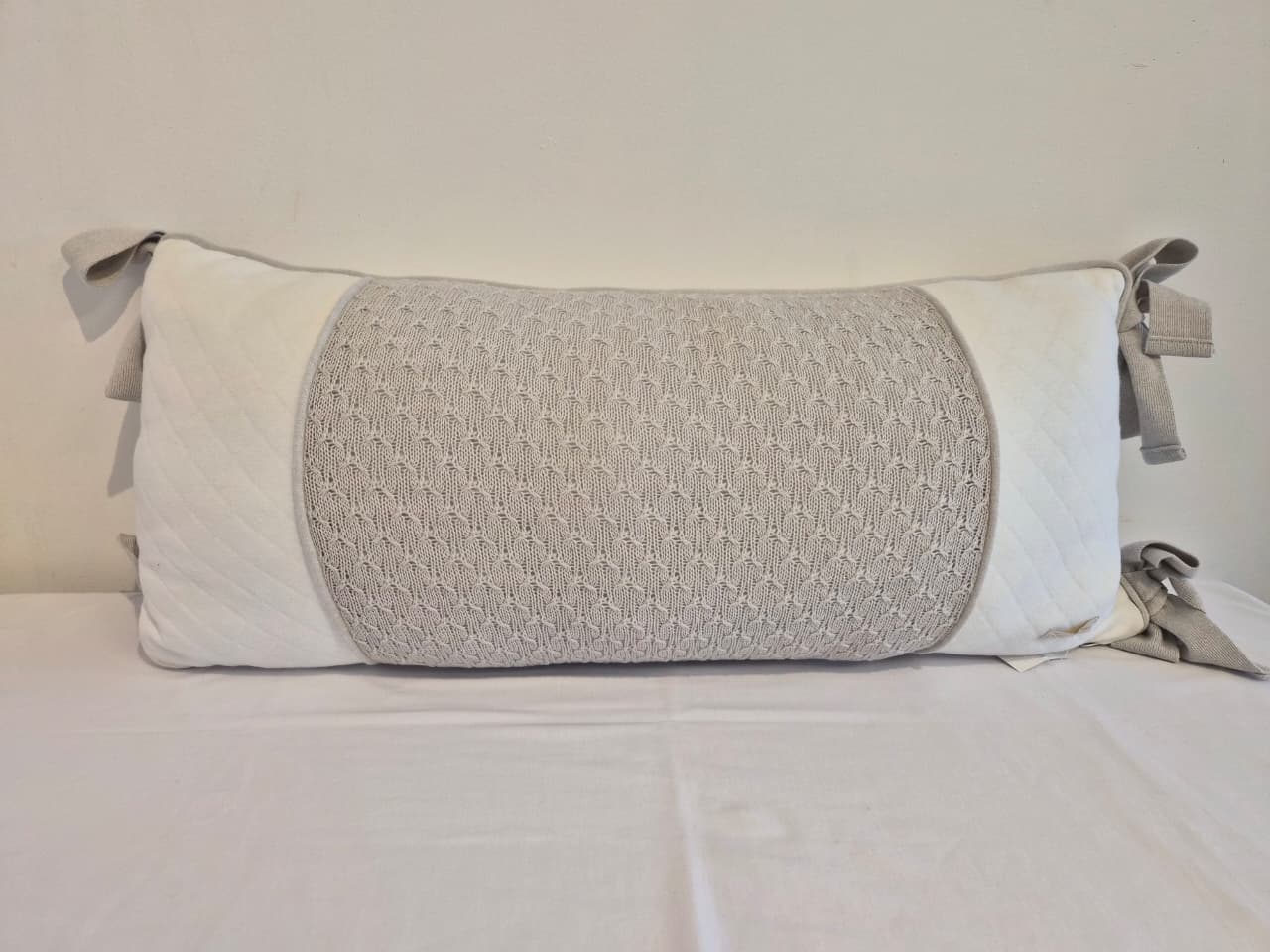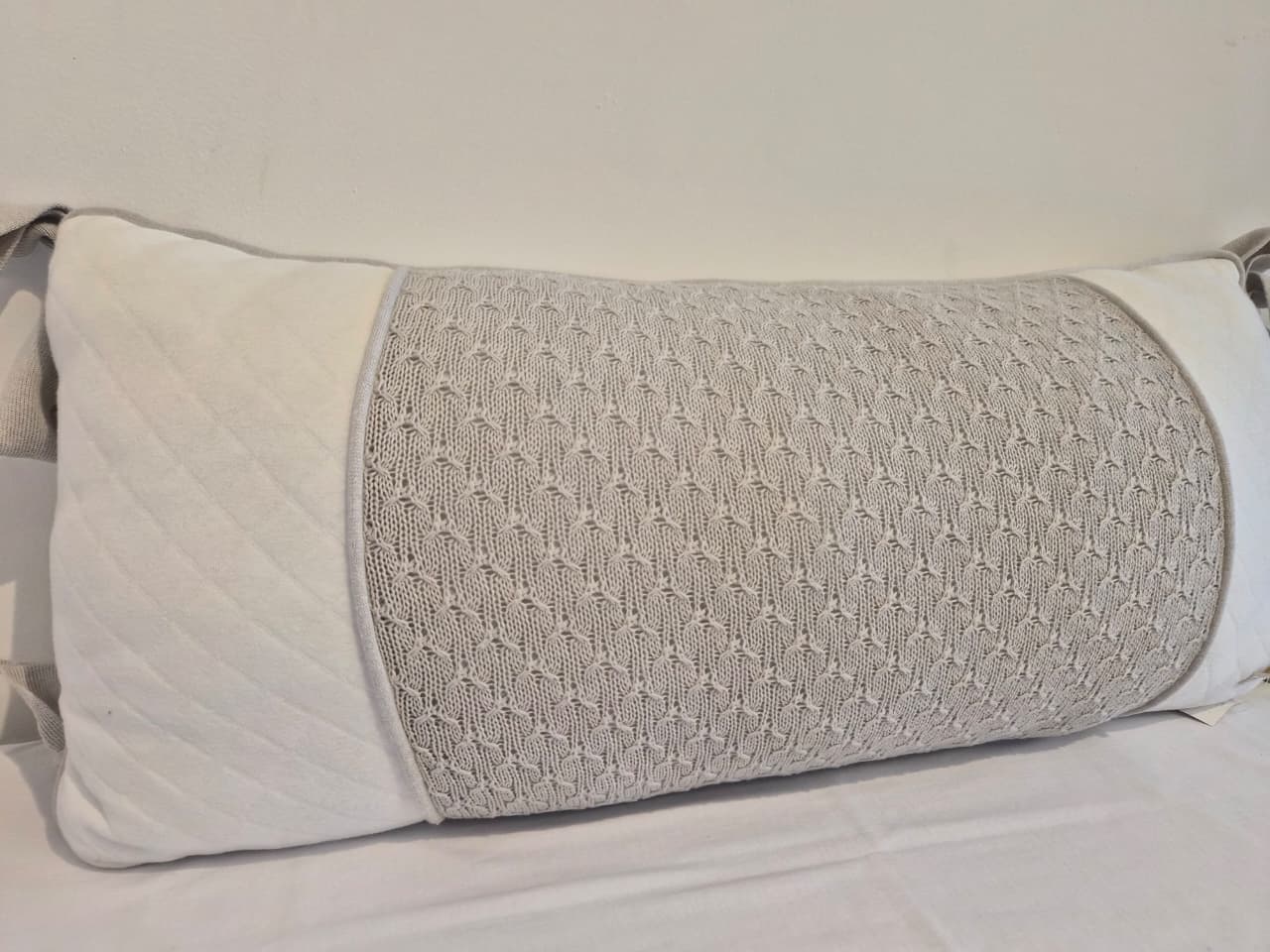 Almofada cabeceira para berço padrão americano feita em jacquard branco com tricô cinza claro 869.medidas: 70 x 30 cm.
