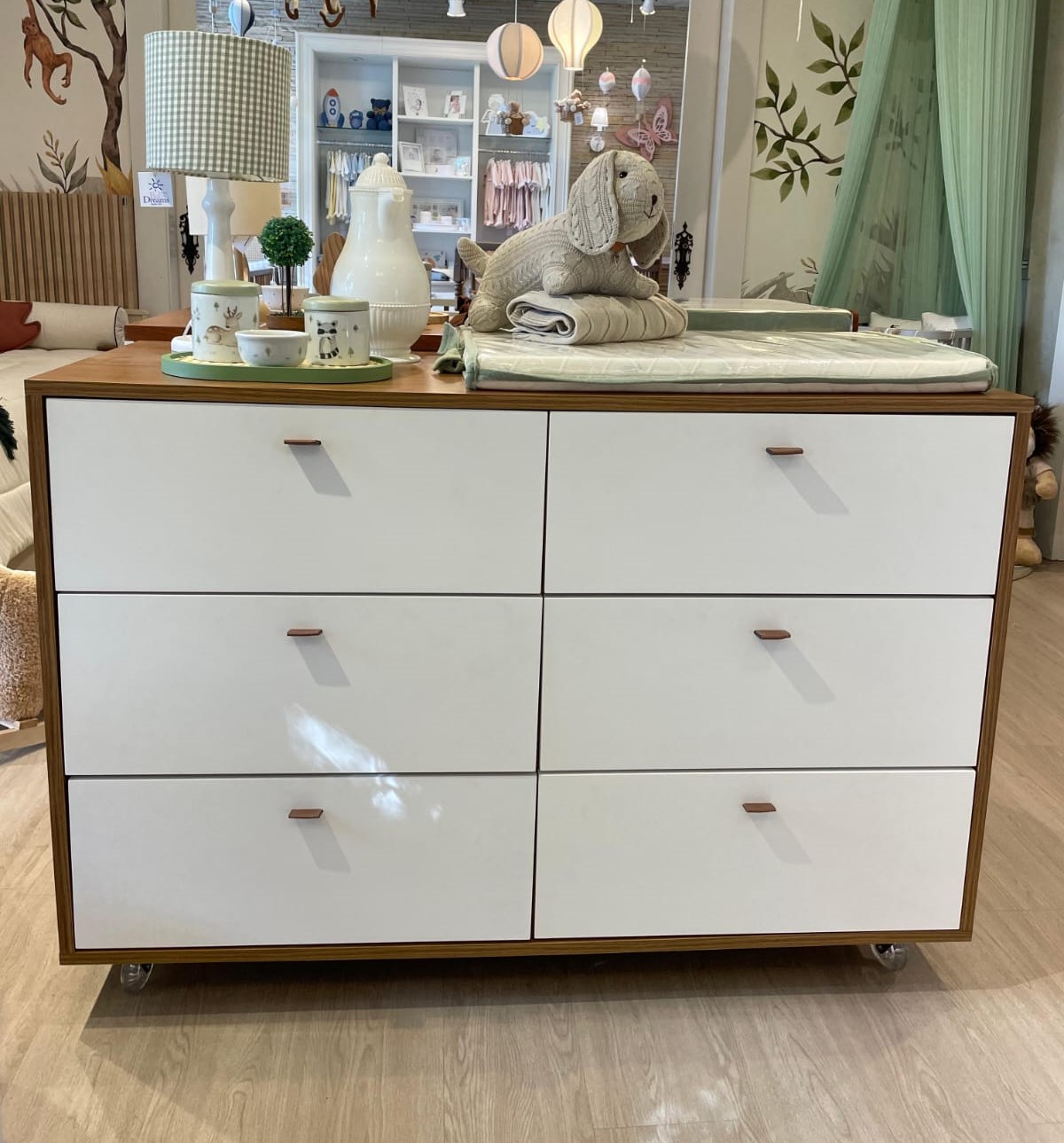 A Cômoda Fazenda é maravilhosa para quem busca organização, espaço e praticidade! Com suas 6 gavetas, você poderá organizar todos os itens essenciais e também as roupinhas do seu bebê. Comporta o trocador e o kit higiene com muito conforto, para que você possa também utilizá-la para trocar o seu bebê. Os pés são em rodinhas de gel, perfeito para facilitar a hora da limpeza. São 4 rodinhas, sendo duas delas com sistema de trava. Medidas: 125 X 50 X 91 cm