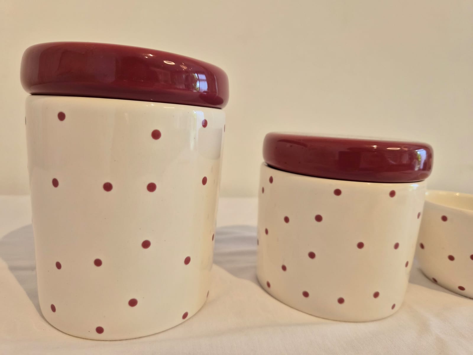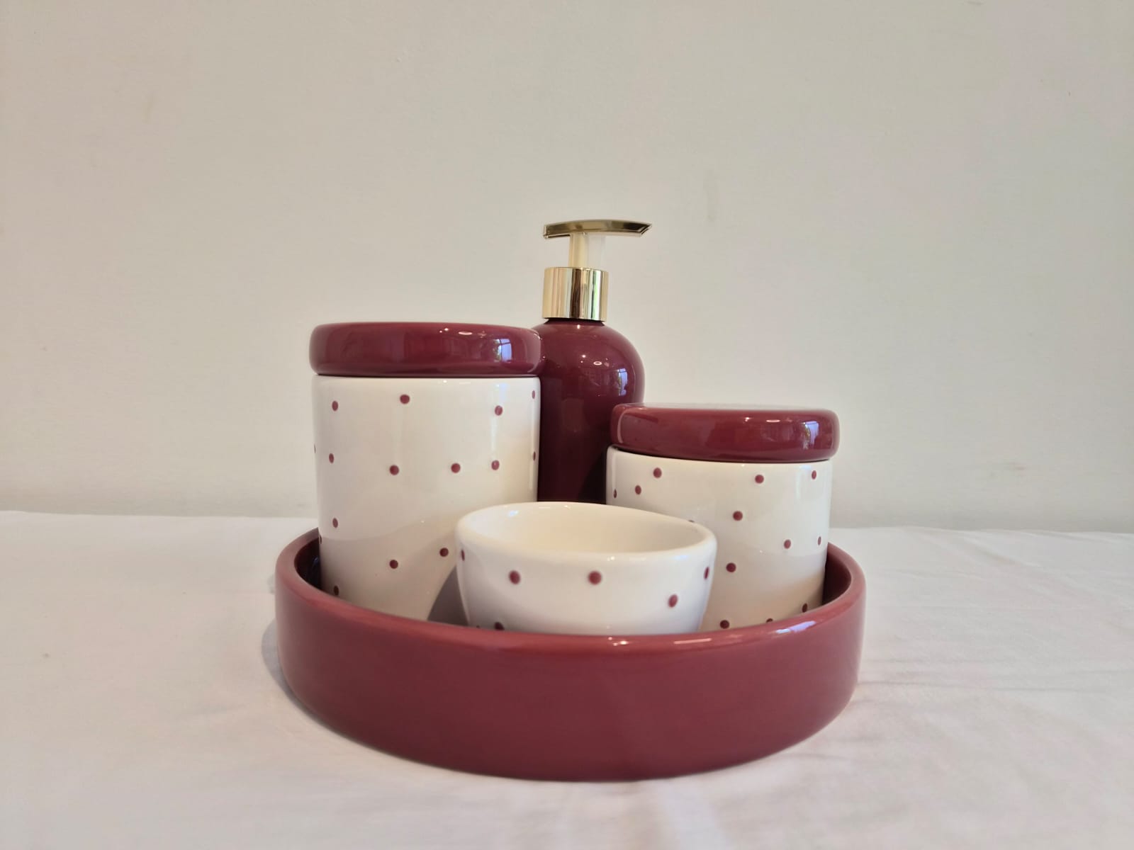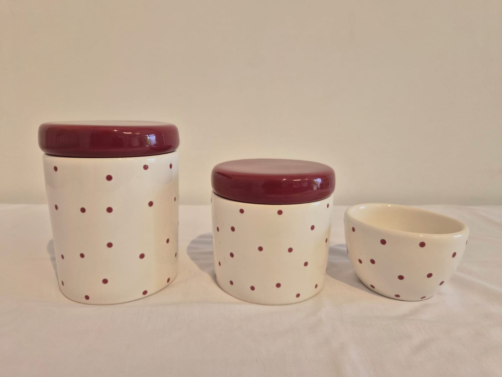 Kit de 3 peças em cerâmica.Potes M e P em cerâmica branco com poá vinho e tampas no vinho liso, ideal para colocar algodão e cotonetes.Molhadeira branca com poá vinho ideal para colocar agua quentinha para a troca de fraldas.Medidas: Pote M - 9x9x11,5cm Pote P - 9x9x9,5cm Molhadeira - 8,5x8,5x5cmBandeja e saboneteira são vendidas separadamente.Consulte nossa equipe de vendas e tire as suas dúvidas.