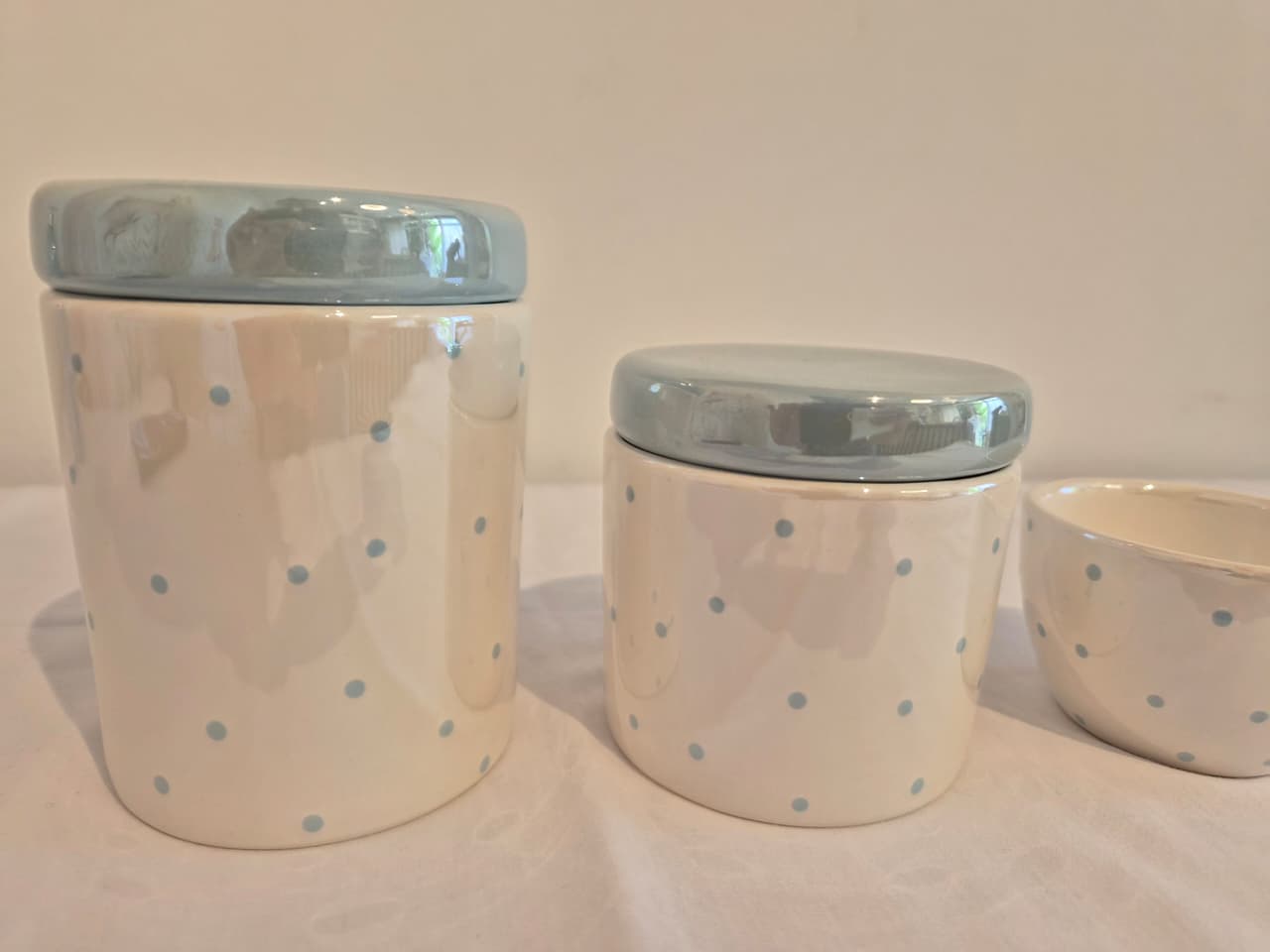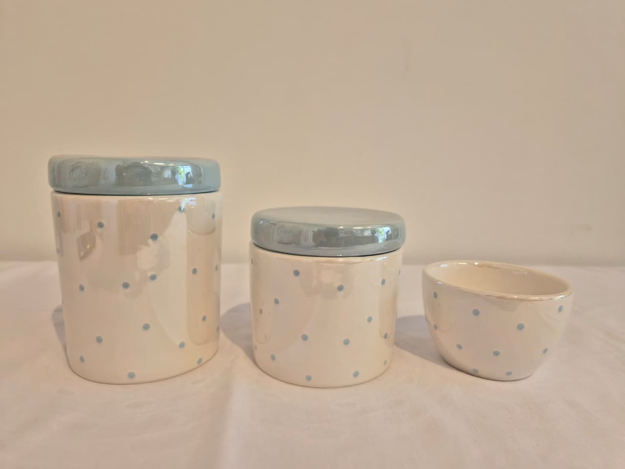 Kit de 3 peças em cerâmica.Potes M e P em cerâmica branco perolizado com poá azul velho tampas azul velho perolizado, ideal p/ colocar algodão e cotonetes.Molhadeira ideal para colocar agua quentinha para a troca de fraldas.Medidas: Pote M - 9x9x11,5cm Pote P - 9x9x9,5cm Molhadeira - 8,5x8,5x5cmBandeja e saboneteira são vendidos separadamente.
