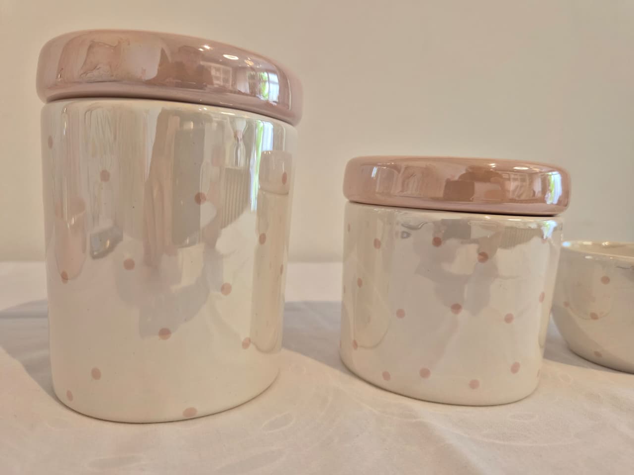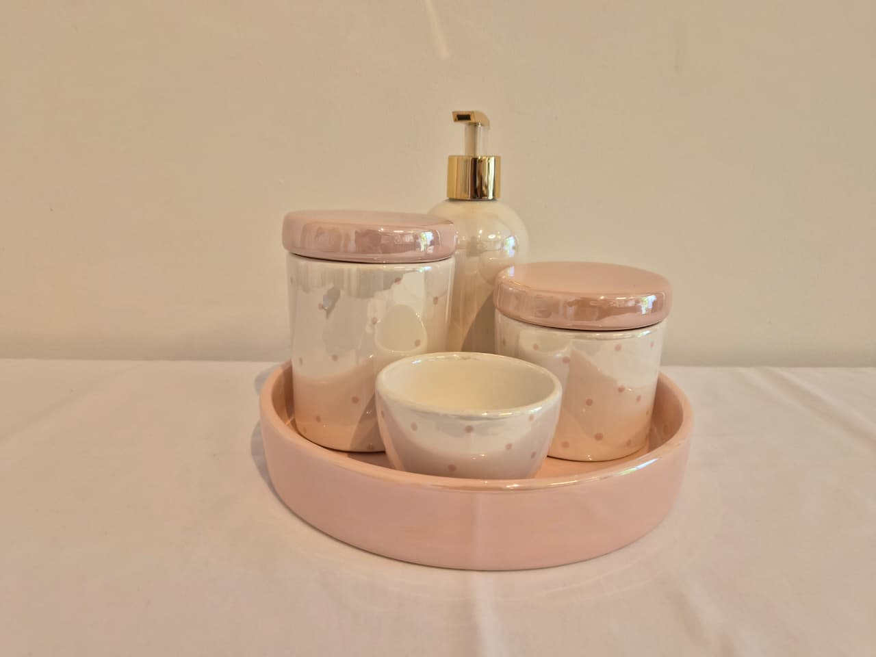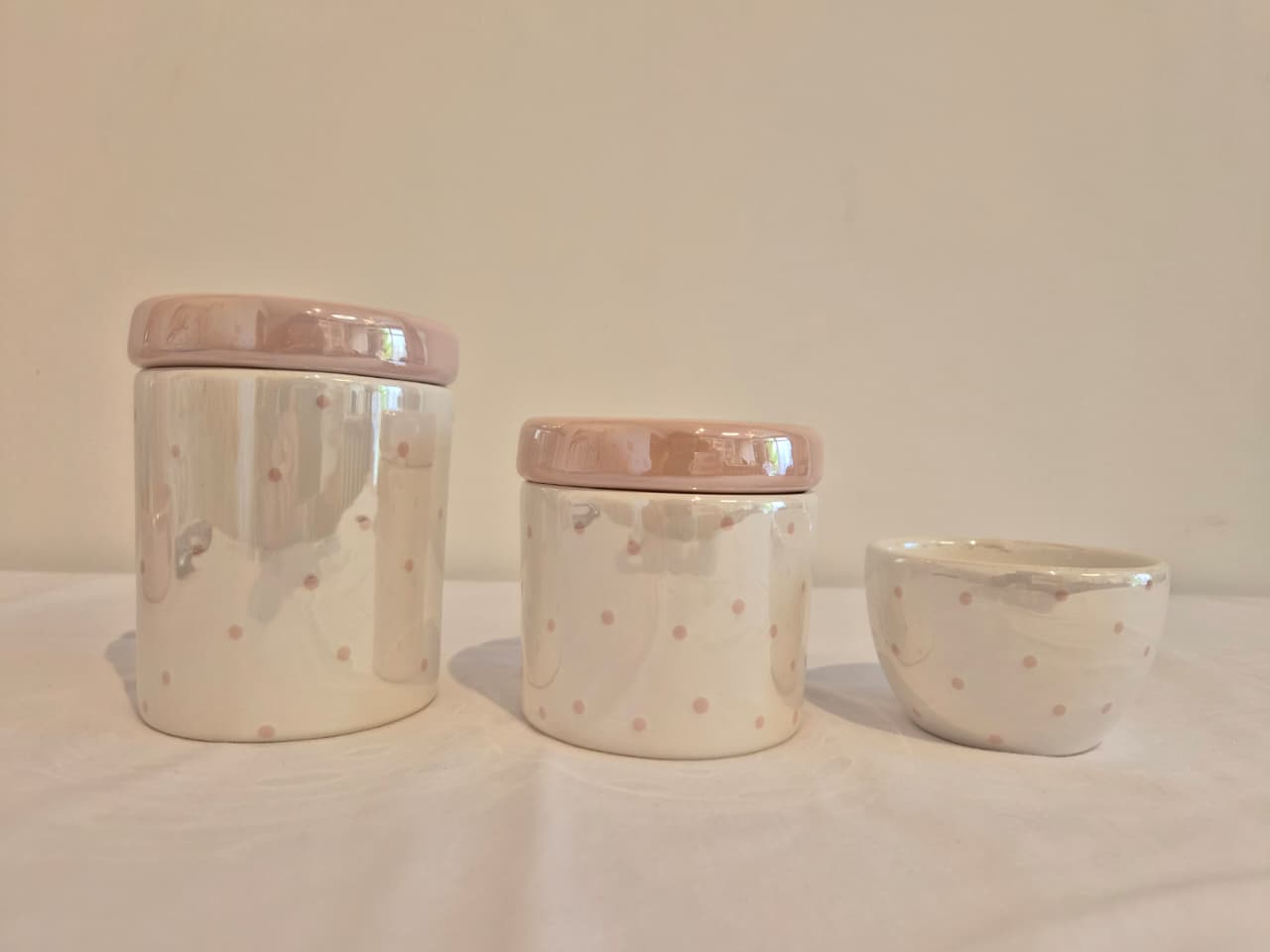 Kit de 3 peças em cerâmica.Potes M e P em cerâmica branca perolizada com poá rosa velho e tampas rosa velho perolizado, ideal para colocar algodão e cotonetes.Molhadeira ideal para colocar agua quentinha para a troca de fraldas.Medidas: Pote M - 9x9x11,5cm Pote P - 9x9x9,5cm Molhadeira - 8,5x8,5x5cm. Bandeja não acompanha o produto