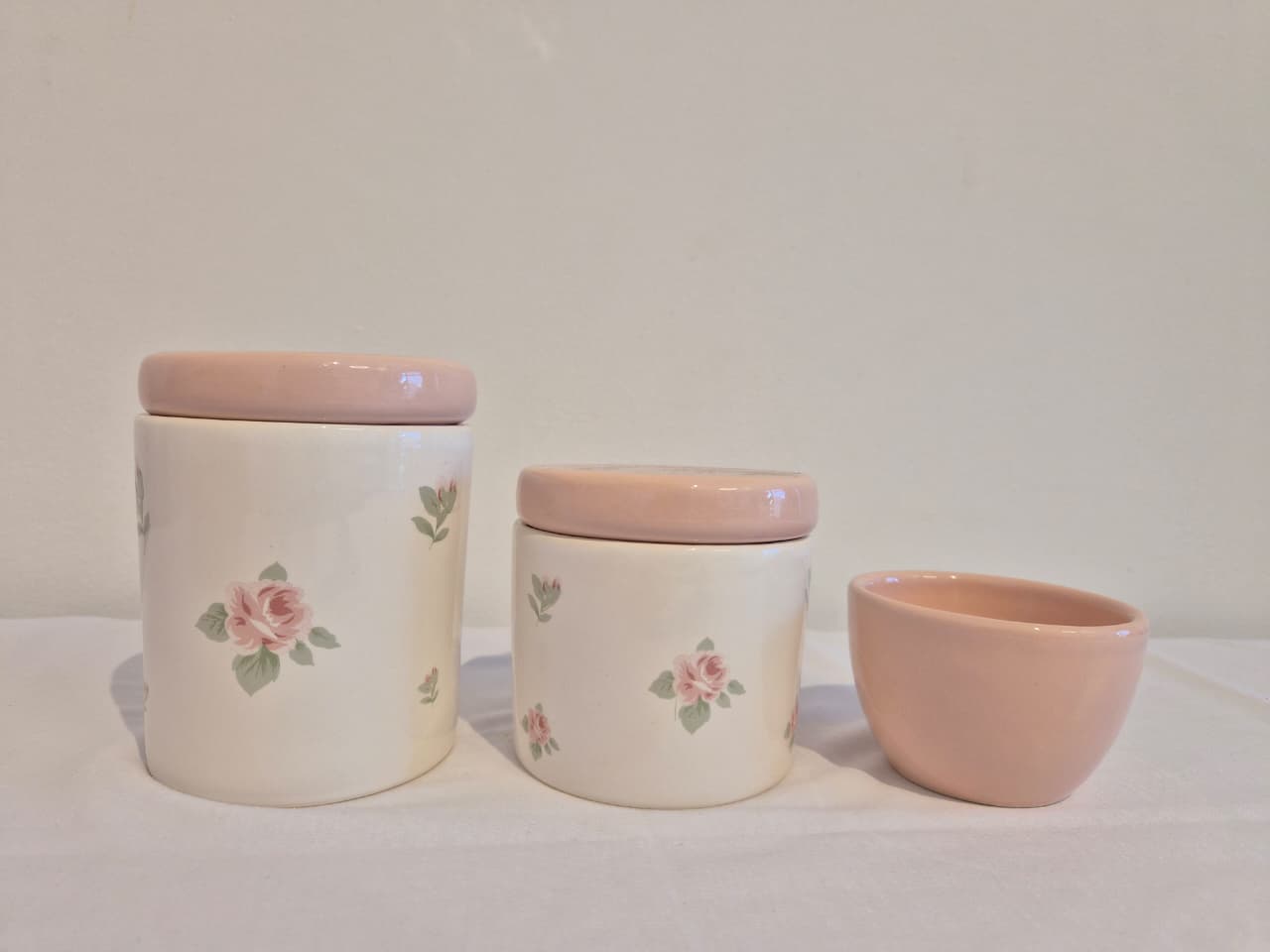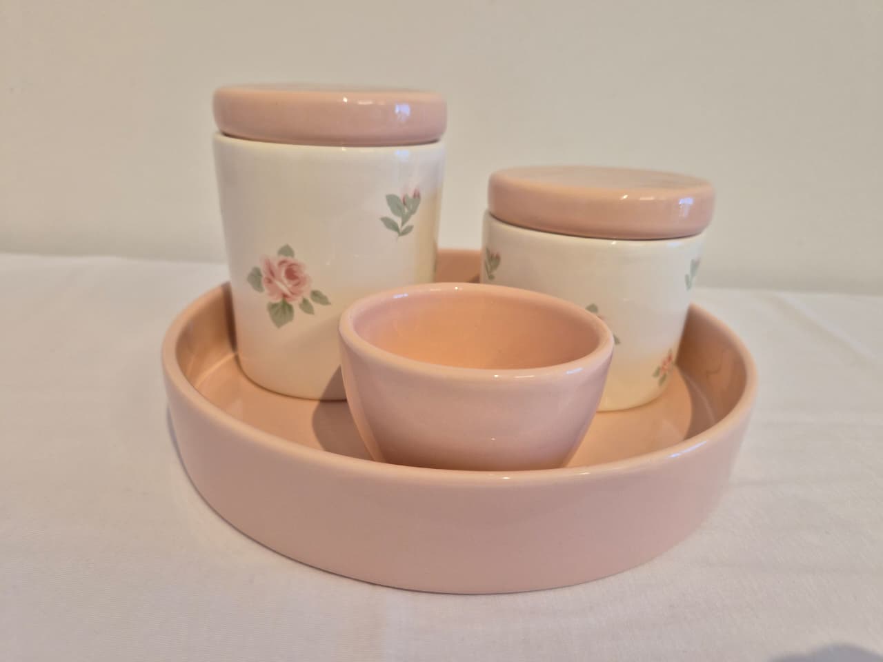 Kit de 3 peças em cerâmica.Potes M e P em cerâmica floral 7 com tampas no rosa velho, ideal para colocar algodão e cotonetes.Molhadeira rosa velho ideal para colocar agua quentinha para a troca de fraldas.Medidas: Pote M - 9x9x13,5cm Pote P - 9x9x11,5cm Molhadeira - 8,5x8,5x5cm . Bandeja não acompanha o produto