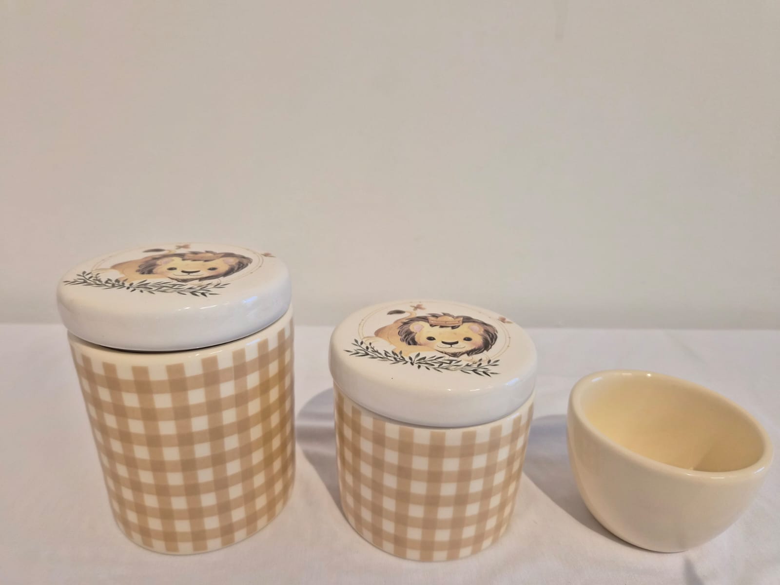 Kit de 3 peças em cerâmica.Potes M e P em cerâmica xadrez bege, ideal para colocar algodão e cotonetes.Tampas com estampa leão e molhadeira lisa bege, ideal para colocar agua quentinha para a troca de fraldas.Medidas: Pote M - 9x9x11,5cm Pote P - 9x9x9,5cm Molhadeira - 8,5x8,5x5cm. Bandeja e saboneteira vendida separadamente.Consulte nossa equipe de vendas e tire as suas dúvidas.