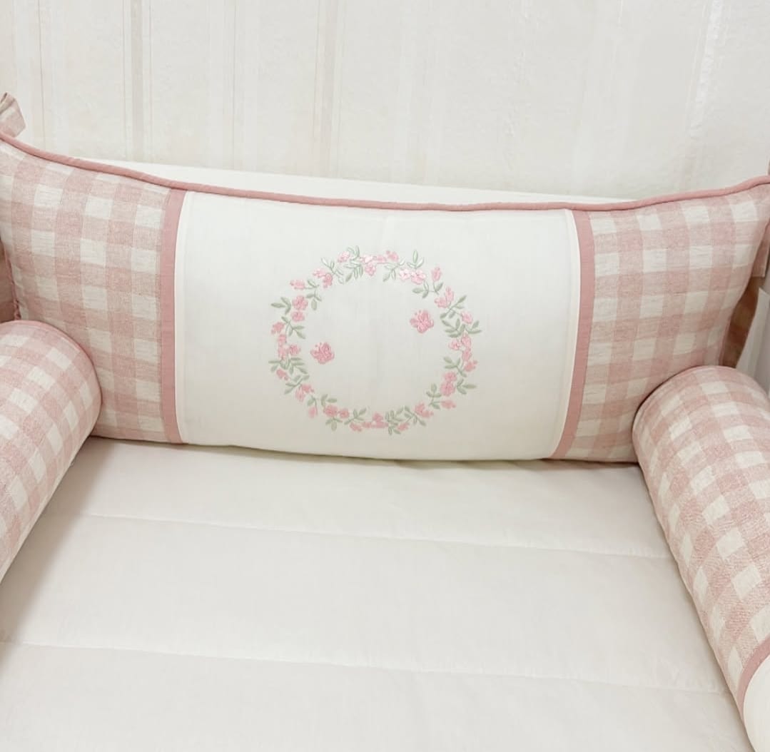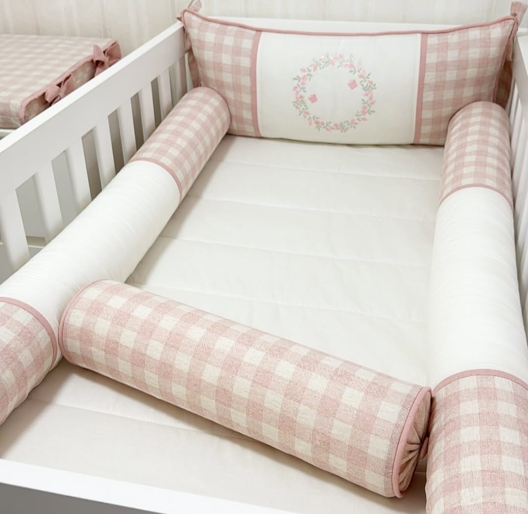 Kit de berço 6pçs percal e linho xadrez rosa AT