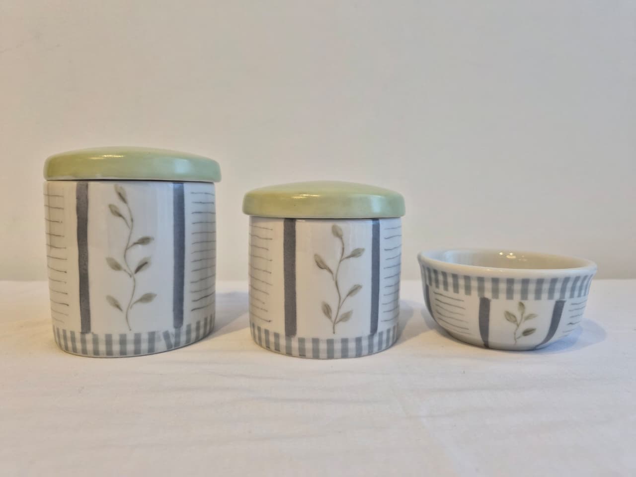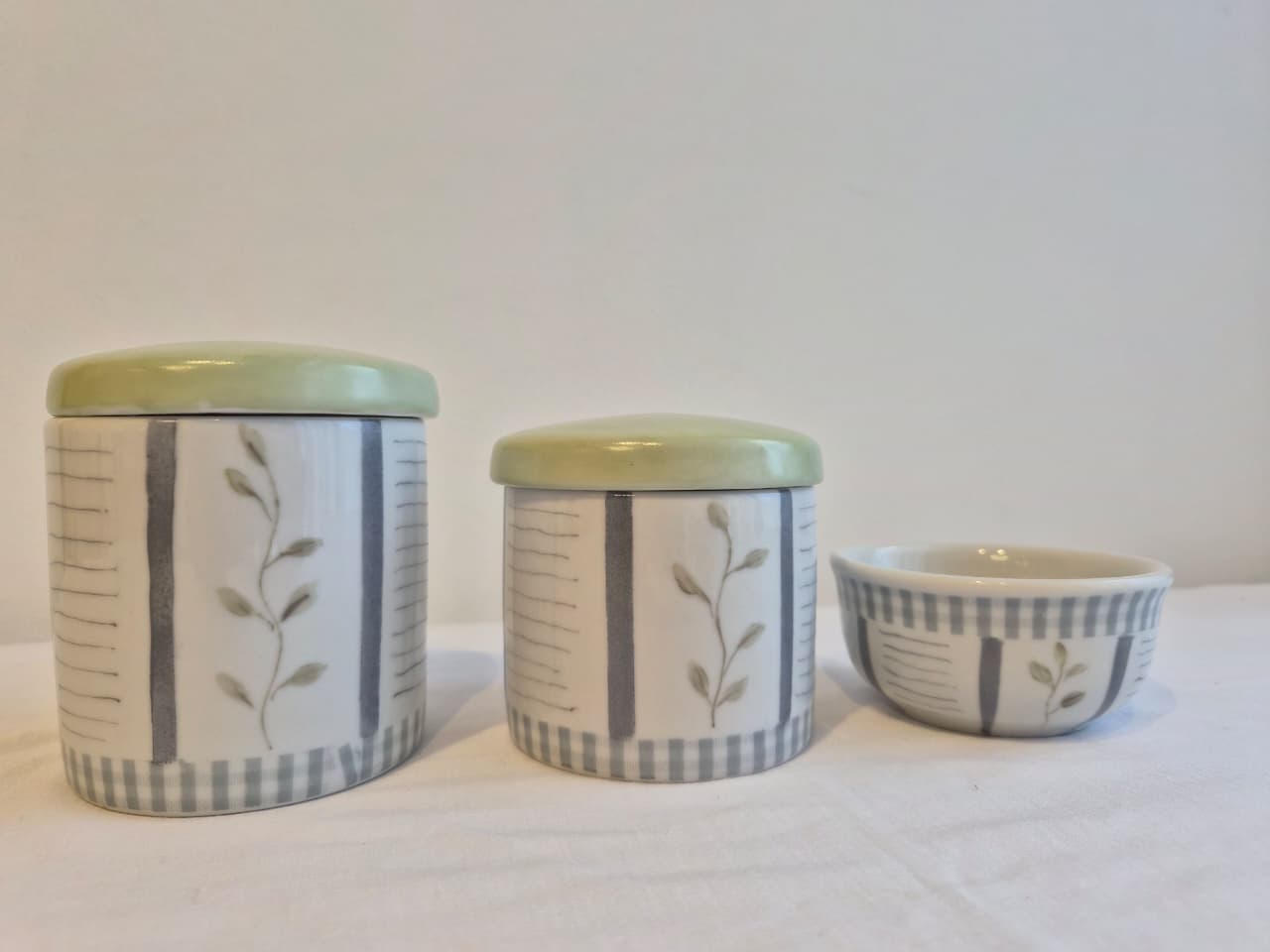 Kit de 3 peças pintado em cerâmica.Potes M e P em cerâmica, ideal para colocar algodão e cotonetes.Molhadeira ideal para colocar agua quentinha para a troca de fraldas.Medidas: Pote M - 9x9x10cm Pote P - 9x9x8cm Molhadeira - 9x9x4,5cm