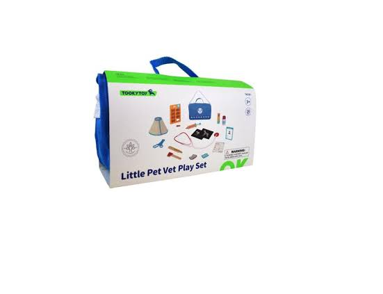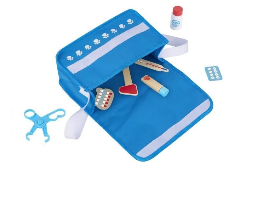 Esta maleta veterinário tem todas as ferramentas e instrumentos que seu filho precisa para diagnosticar e curar qualquer animal de estimação ou brinquedo de pelúcia. Com lindas peças de madeira e tecido como um veterinário de verdade teria, seu filho vai adorar ajudar seus amigos pets com este kit. Esta maleta veterinário vem com um termômetro de madeira, agulha, martelinho, estetoscópio e potes de creme, bem como radiografias de papelão, blocos de prescrição, ficha do paciente, tabelas de dosagem, tesoura de plástico e um cone de tecido. Todas essas peças são cuidadosamente armazenadas em uma linda maleta de tecido para que nossos pequenos veterinários possam viajar para qualquer lugar, curando nossos preciosos animais.Indicação: 3+
