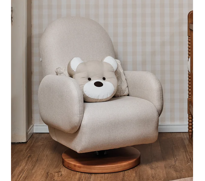 A Poltrona de Amamentação Curve foi desenvolvida para proporcionar um conforto excepcional e um design moderno para os momentos de amamentação. Ela oferece duas opções: o disco em madeira + giro sem saia, que garante praticidade e movimento suave, ou pés fixos em madeira, mantendo um visual mais clássico e sofisticado, também sem saia. Ambas as opções combinam elegância e funcionalidade, adaptando-se perfeitamente ao seu espaço. ** Puffe vendido separadamente. **