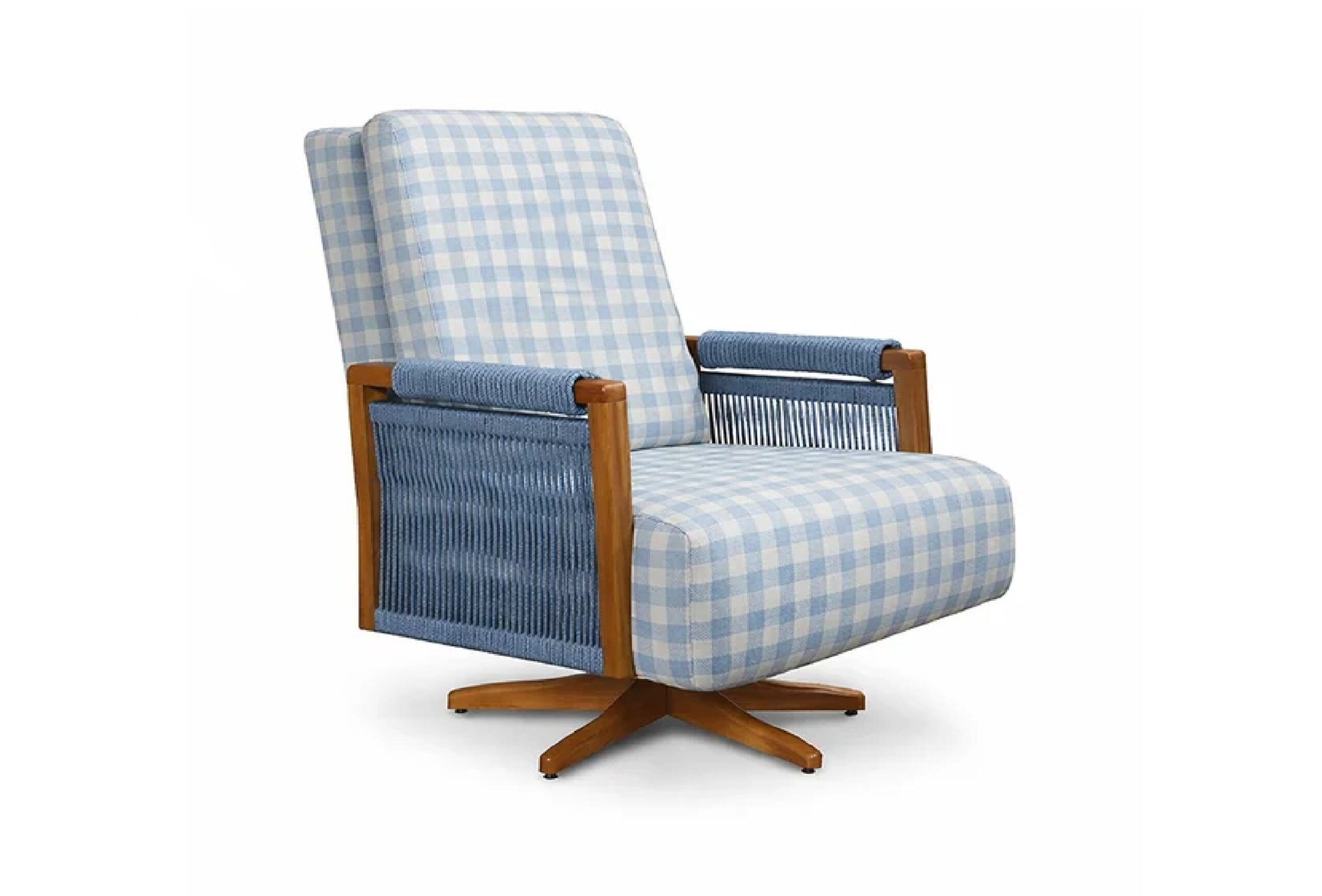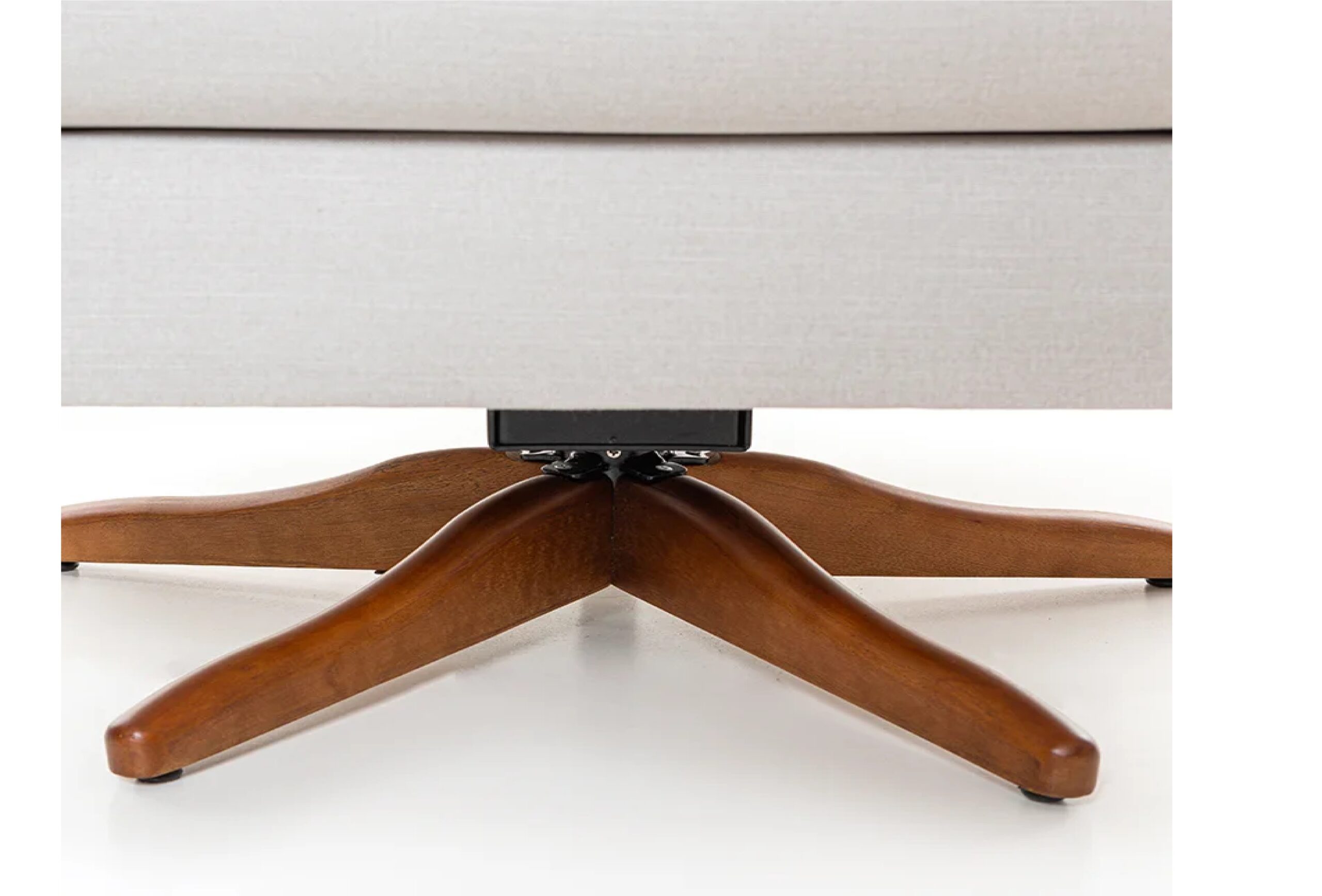 A poltrona é projetada com pés giratórios em madeira maciça, que conferem um toque de elegância e modernidade, além de balançar e girar em 360°.