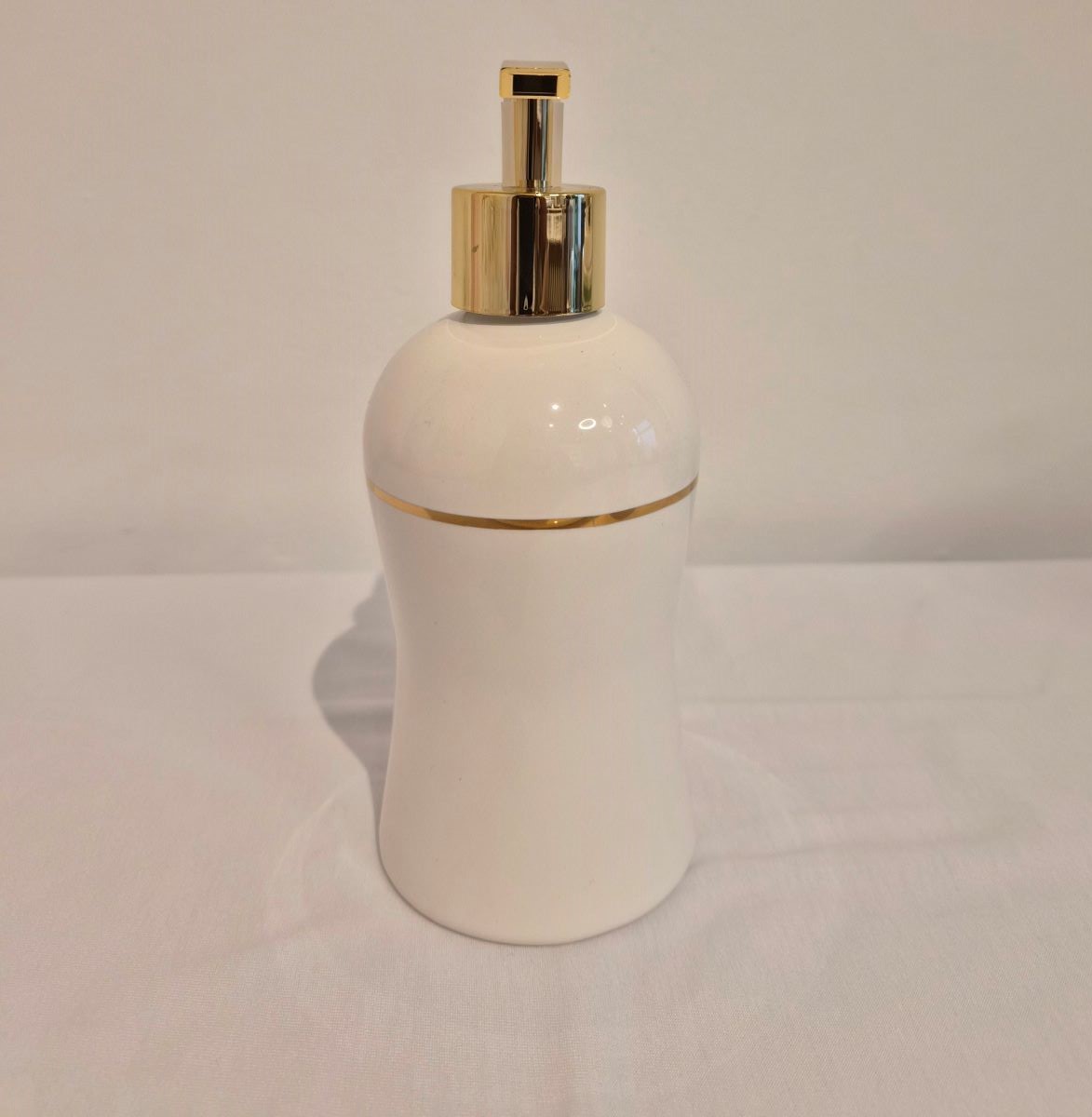 Saboneteira em cerâmica Veneza branca perolizada com filete ouro e com válvula em dourado ideal para colocar álcool em gel ou sabonete líquido.Medidas: 8 x 8 x 19cm