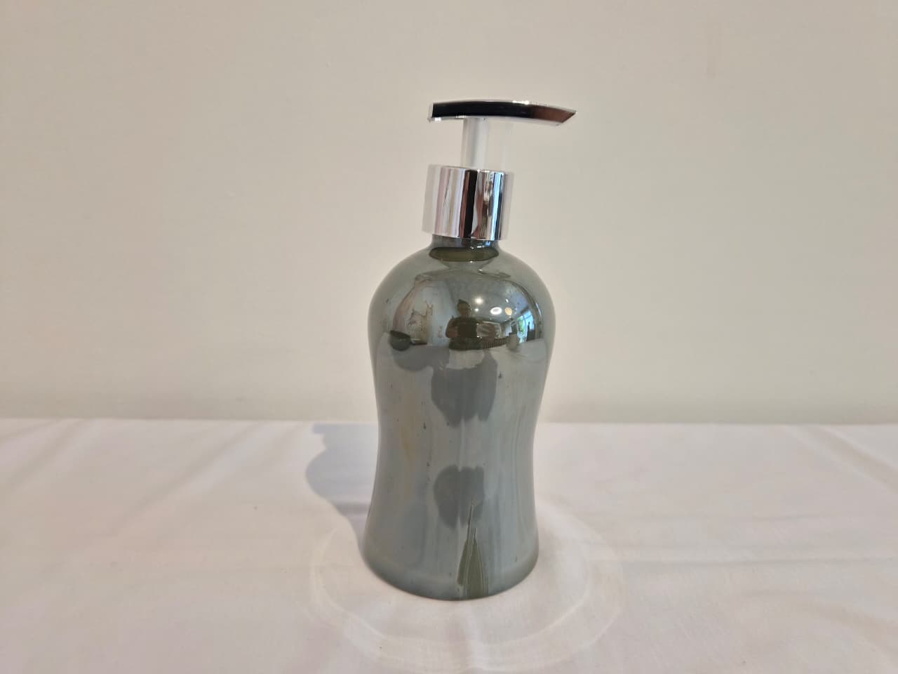 Saboneteira em cerâmica Venezaverde celadom perolizado com válvula em dourada ideal para colocar álcool em gel ou sabonete líquido.Medidas: 8 x 8 x 19cm